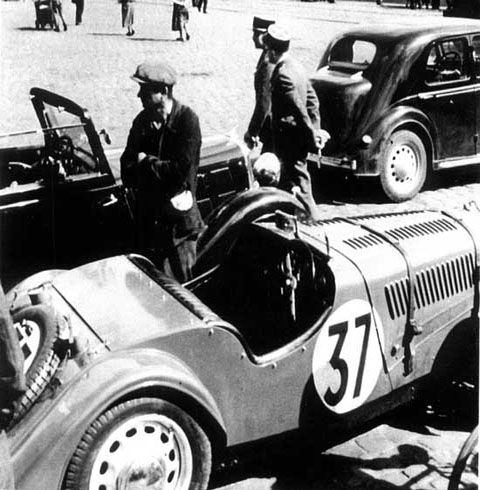 1939 Le Mans scrutineering - White and Anthony pose for photograph (Ref 11) The Morgan was presented at the Halle aux Toiles for weighing and scrutineering which took place on the Tuesday and Wednesday before the race. Earle Howe was representing the RAC on the AIACR committee. The car passed without comment. The track had been considerably altered since 1938 and practice was key to all the crews. The road past White House Corner had been widened considerably and improvements had been made to the track surface over its entire length. Practice took place between 1 am and 6 am on the Thursday and Friday night. Anthony and White took turns at the wheel with Charlie Curtis stationed at the pits. True to the rules of the day, only one nominated person was allowed to man the pits and that of course, was Curtis. During Anthony’s stint, the Morgan had problems with the head gasket which Charlie Curtis duly changed. Otherwise, practice was uneventful other than the drenching rain that fell on Friday evening. Start of the RaceThe Morgan party awoke on the Saturday morning to a fine day with high clouds in a motionless blue sky. Of the 49 entries, 42 cars lined up for the start. Dick Anthony was down to start the race in international company. The pre race favourites were of course the French. The French ace Jean-Pierre Wimille (the ’37 winner) was partnered by Veyron in a Bugatti Type 57 ‘tank’ with supercharged 3.3 litre engine and an advanced stream-lined body. No less than 8 Delahaye-Delages of 3.6 litre, 2 Delages of 3.0 litre, 6 Talbots and 8 Simcas were also entered bringing the French entry to 25.
